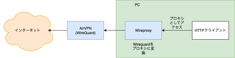 WireGuardのVPNをプロキシとして提供するWireproxyというものがあるのでそれを使ってプロキシ化します。